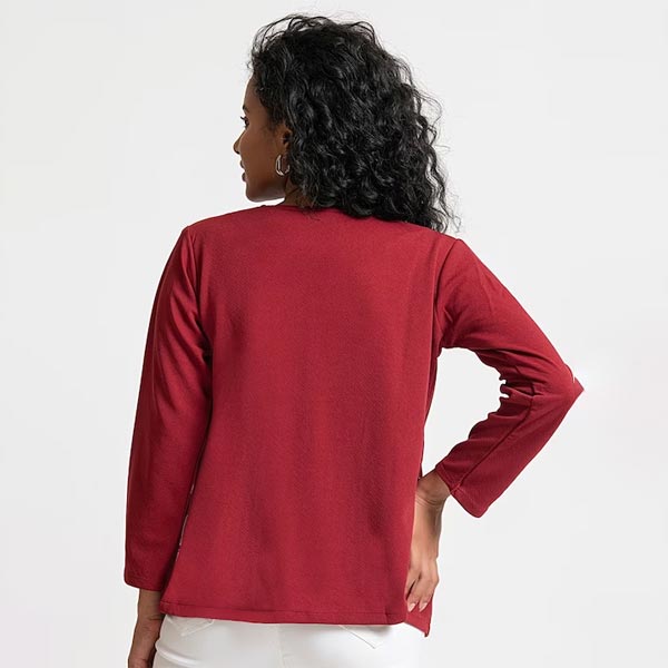 Maroon solid open front regular shrug ,has long sleeves, straight hem